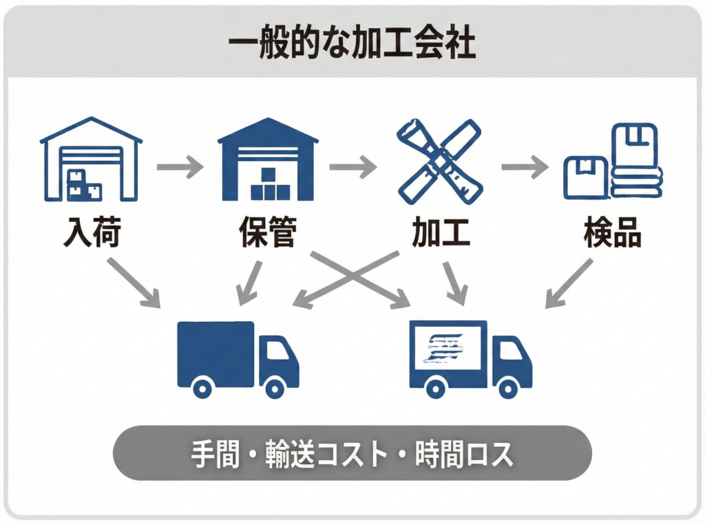 一般的な加工会社では、「入荷→保管→加工→検品→出荷」の工程が、複数の場所・業者にまたがることが多く、その分だけ手間・輸送コスト・時間ロスが増えてしまいます。