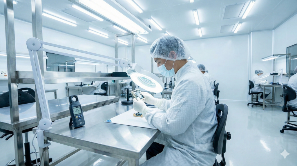 加工室はJIS規格に準拠した照度設計となっており、1,000ルクス以上の明るさを確保