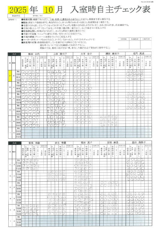 入室前には、手洗い・アルコール消毒・着帽・防塵服の着用を必須とし、異物や汚染の持ち込みを防止しています。入室時にはその都度、自主チェック表を用いて身だしなみや健康状態を確認し、衛生管理の意識を全スタッフに浸透させています。