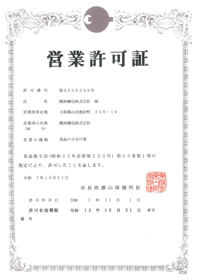 本社工場と関西ロジスティクス加工所(SPAKL)の2拠点で、以下の製造・包装許可を取得しています。