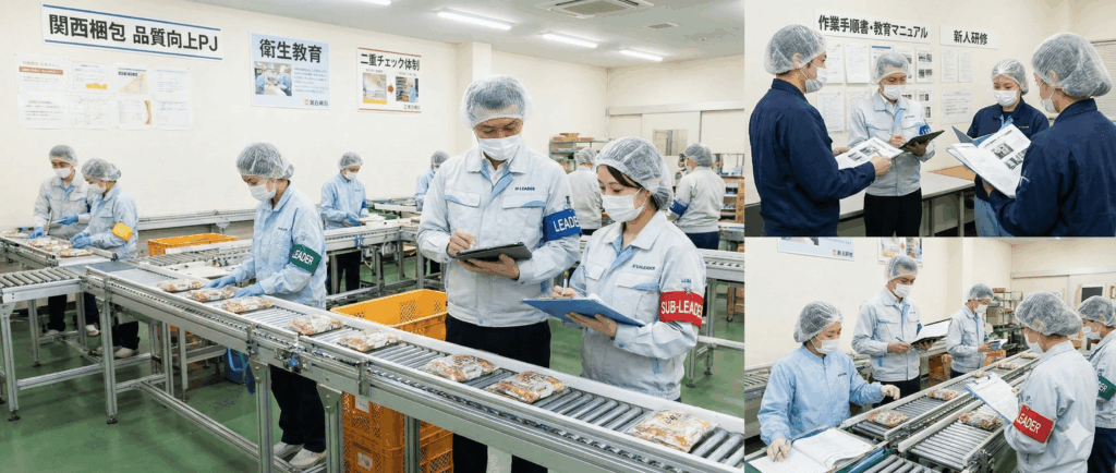 関西梱包では、安定した加工品質を維持するために、経験豊富なスタッフに加え、ラインリーダー・サブリーダーによる二重チェック体制を整えています。