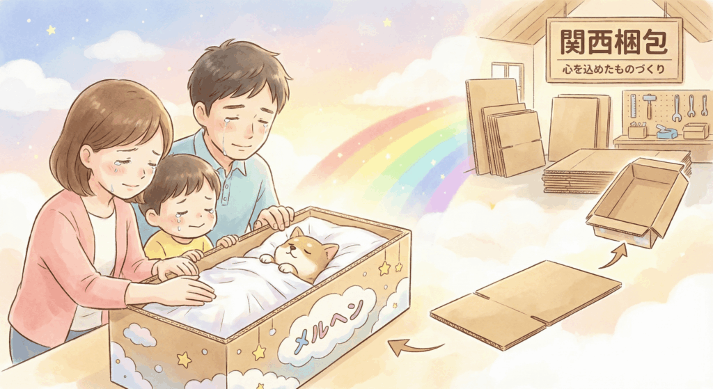 関西梱包では、流通加工・包装事業に加えて、自社オリジナル製品として ペット用棺「メルヘン」シリーズ の製造を行っています。